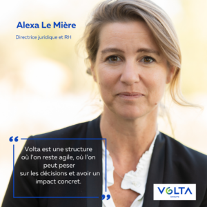 Volta réunissait tous les ingrédients que je recherchais : une entreprise à taille humaine, un secteur que je connais et dans lequel je crois profondément, celui des énergies renouvelables. Le fait de pouvoir être associée aux instances de direction pour contribuer non seulement sur le plan juridique mais aussi sur des réflexions plus stratégiques a également participé de mon choix. La rencontre avec Benoît Duval et Pierrick Morier a confirmé mon intuition : une culture d’entreprise simple, humaine, où la parole est libre et la communication directe. Je peux le vérifier au quotidien. Par ailleurs, Volta est une structure où l’on reste agile, où l’on peut peser sur les décisions et avoir un impact concret.